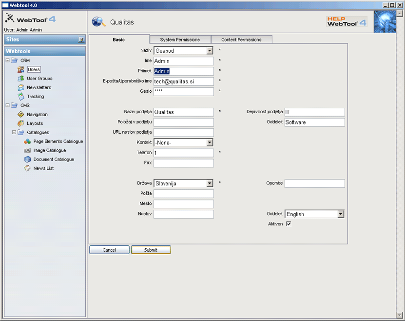 V zavihku Basic lahko urejamo podatke, ki jih je uporabnik vpisal preko registacijske forme v bazo.