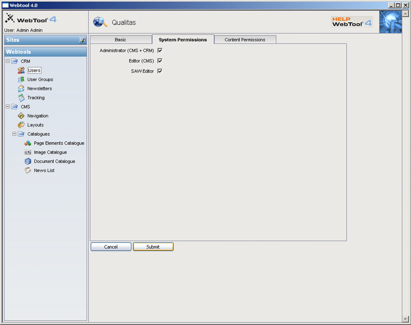 Administrator ima v Webtoolu pravice za dostop do sistema za urejanje uporabnikov (CRM) in sistema za urejanje vsebin (CMS).