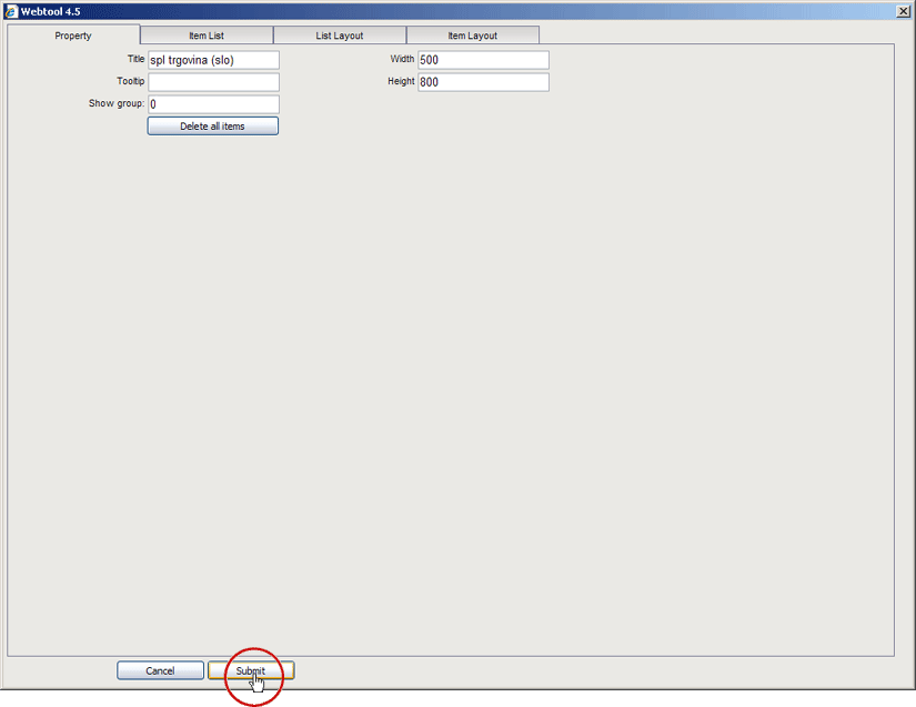 - Element shranimo v katalogu elementov ter ga hkrati postavimo na stran s klikom na tipko "Submite".