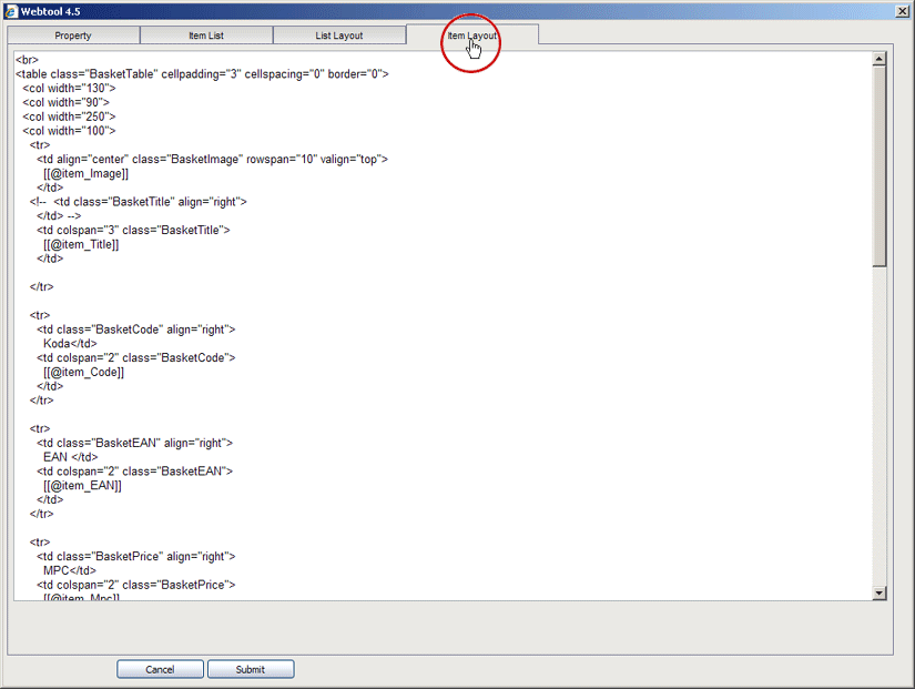 Zavihek predloga artikla - Item Layout