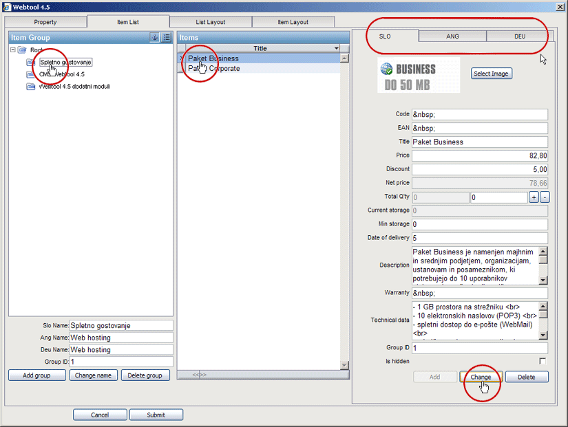 - Izberemo zavihek z oznako jezika za urejanje podatkov o artiklu v izbranem jeziku
