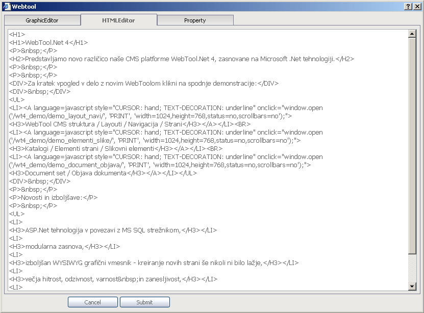 Vse kar želimo objaviti na spletnih straneh je v resnici zapisano v obliki posebnega računalniškega jezika - HTML kode. V zavihku "HTMLeditor" lahko vidimo kodo, ki je rezultat našega vnosa vsebin preko grafičnega vmesnika - "GraphicEditor".