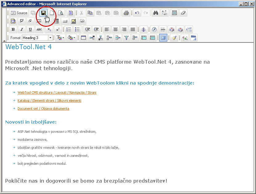 Napredni urejevalnik je funkcionalno nadgrajen grafični urejevalnik. Uredniku je v njem dostopna širša paleta možnosti, kar hkrati pomeni tudi veliko večjo odgovornost pri urejanju vsebin!