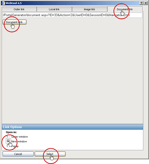 S klikom na tipko izberi "Select" vstavimo povezavo na dokument.