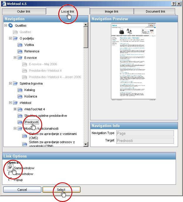 Lokalna povezava se uporablja za povezavo do vsebin, ki so del naše spletne predstavitve, zato po navadi vsebino na katero kaže povezava odpremo v istem oknu.
