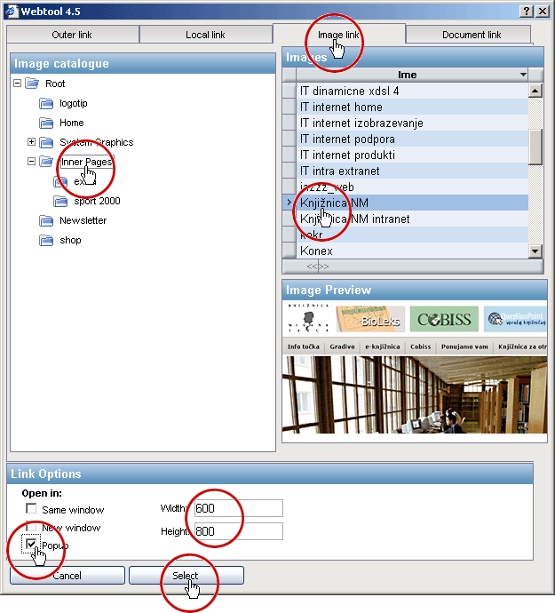 Označimo, da bomo sliko odpirali v posebnem oknu "Popup".