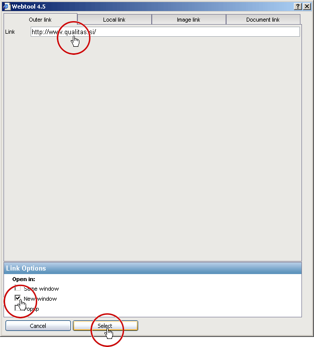 Izberemo zavihek zunanja povezava "Outer link" (zavihek je na začetku že izbran)