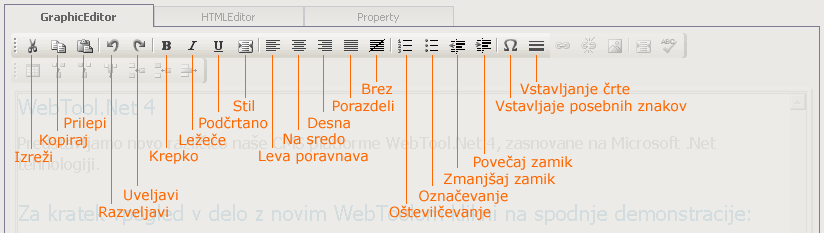 Grafični vmesnik ima svoja orodja, ki nam služijo za oblikovanje besedila. Kljub temu lahko rečemo, da je njihovo delovanje zelo podobno delovanju podobnih orodij v Wordu ali kakšnem drugem urejevalniku.