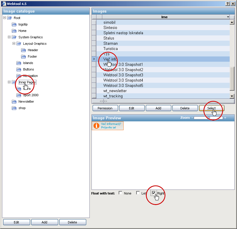 Ko imamo odprt katalog slik, lahko sliko iz njega izberemo. Če pa slike v katalogu še ni jo lahko najprej dodamo. Pri tem so nam na voljo vse funkcije, ki jih katalog ima: urejanje strukture kataloga, dodajanje, urejanje in brisanje slik (glej Katalog slik).