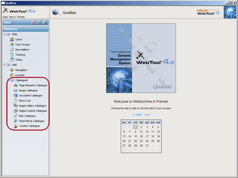 Poleg kataloga elementov uporabljamo še posebne dodatne kataloge (katalog slik, katalog dokumentov, listo novic ...) v katere shranjujemo slike, dokumente, novice ...