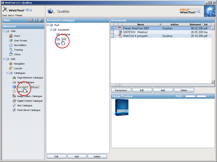 S klikom na katalog dokumentov "Document Catalogue" odpremo okno, ki v obliki drevesne strukture imenikov prikaže strukturo kataloga.