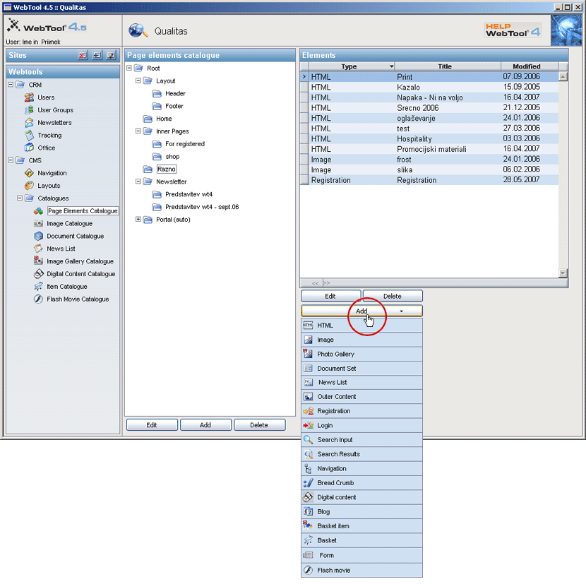 4. Odpre se nam novo okno (popUp) za dodajanje elementa, ki je za vsako vrsto elementov drugačno.