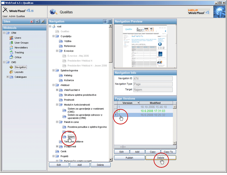 Ko verzijo strani pobrišemo se dejansko brišejo "navodila" kako to stran prikazat in instance elementov. Elementi, ki so bili na tej verziji strani prikazani, pa ostanejo shranjeni v katalogu elementov.