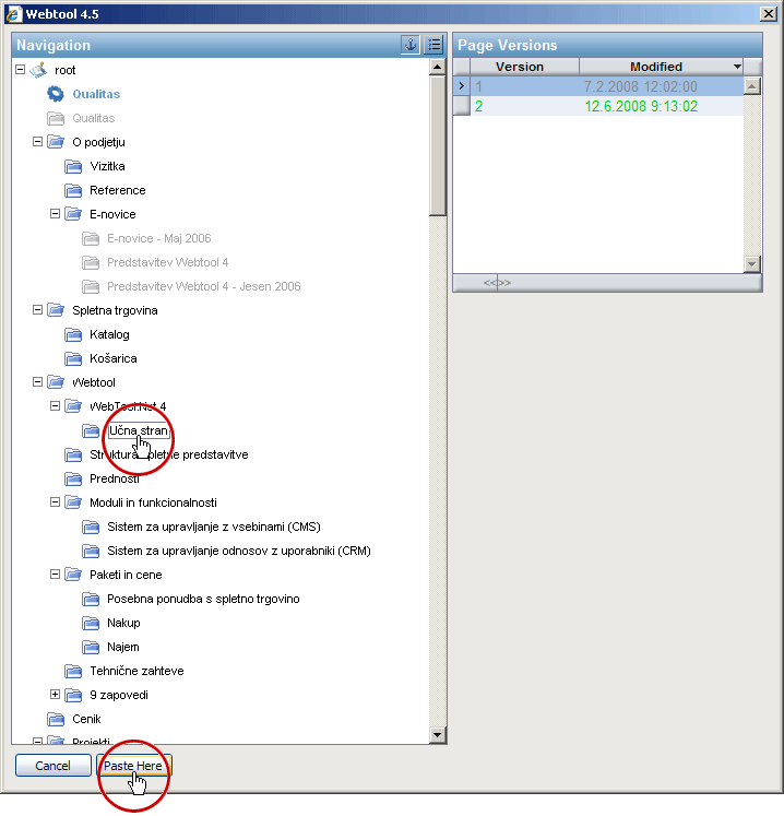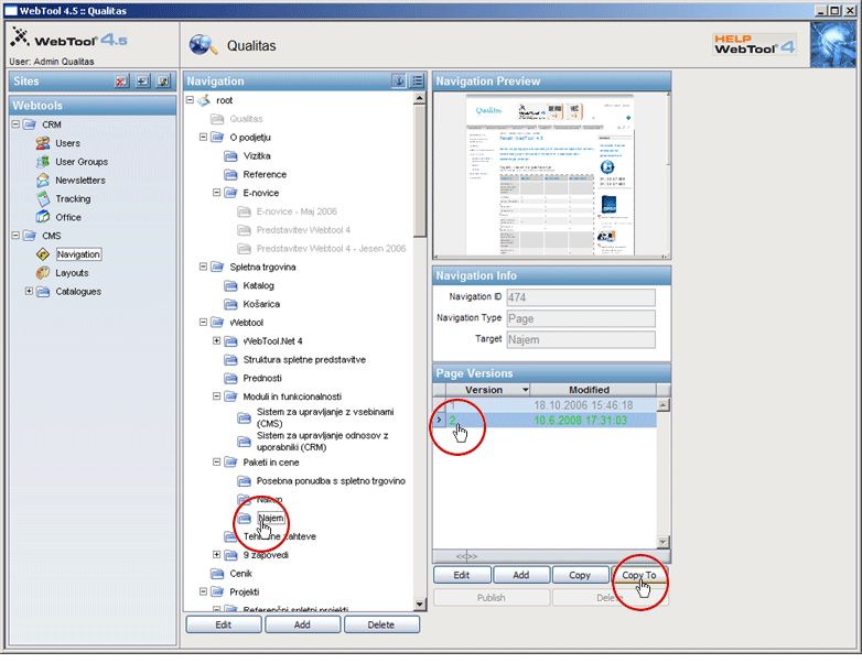 - V primeru, da kopiramo kopiram v "Copy to" se nam odpre okno z navigacijo kjer izberemo kje v navigaciji bomo naredili kopijo verzije strani.