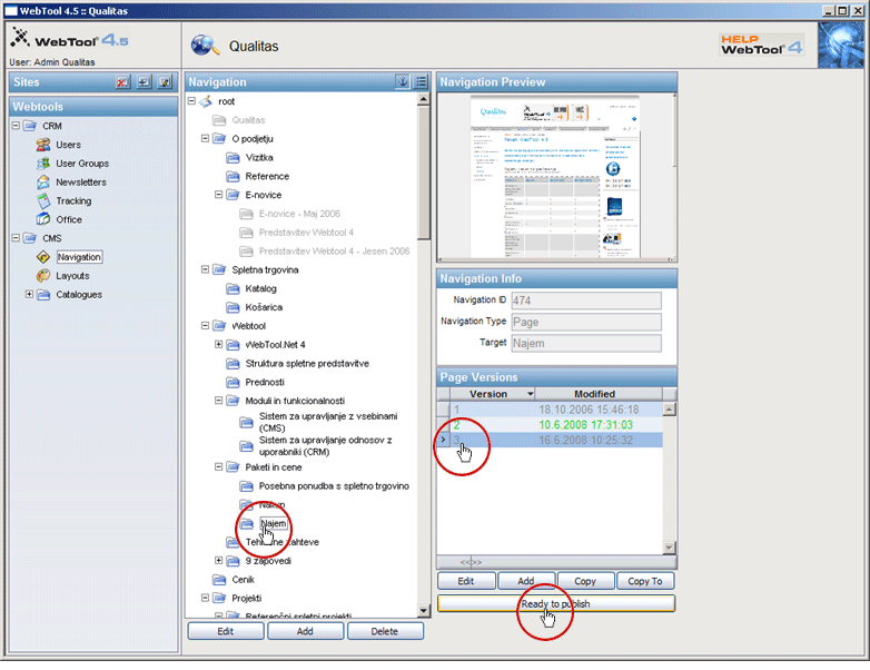 - Izberemo neobjavljeno verzijo strani, ki jo želimo prikazati na strani kamor kaže navigacija