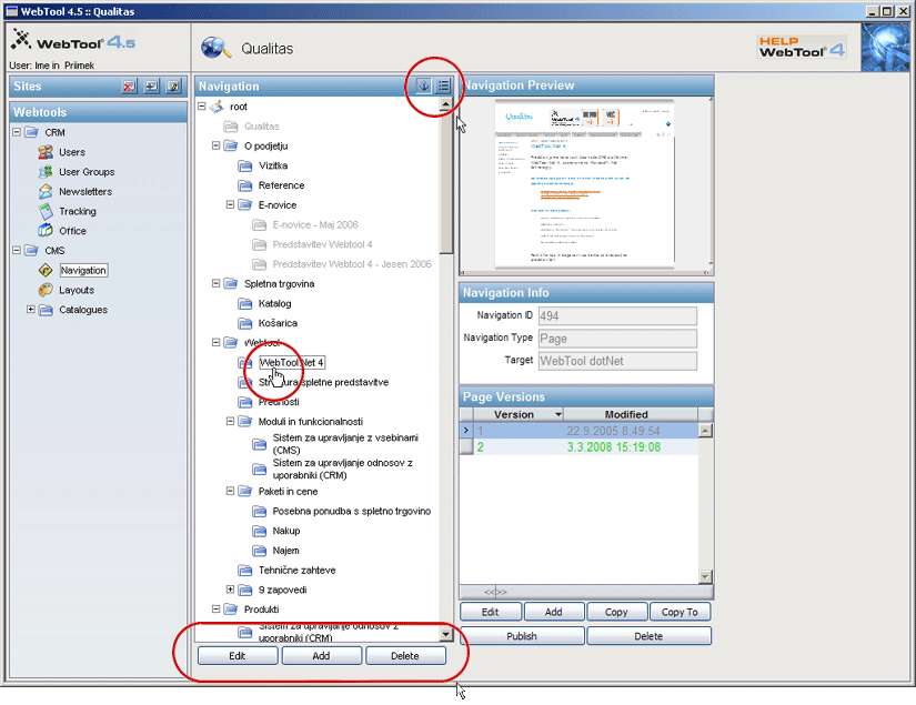 Navigacija spletne predstavitve je, podobno kot struktura imenikov na disku, predstavljena v obliki drevesne struktutre in delo z njo je razdeljeno na več funkcij: