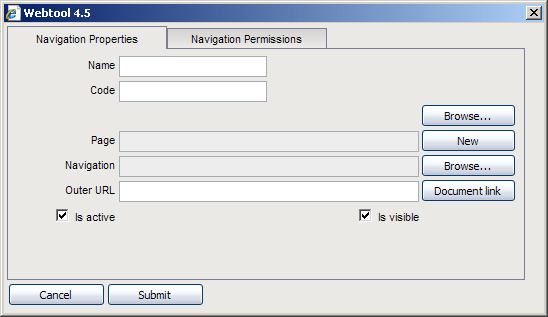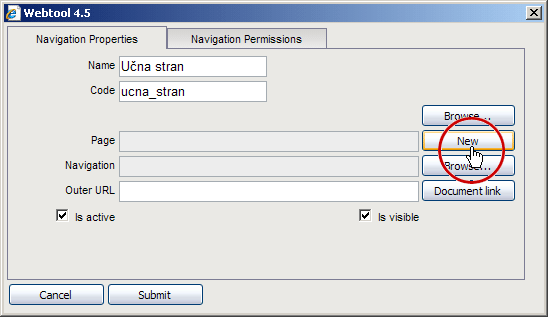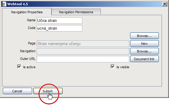 Polja "Page", "Navigation" in "Outer URL" se med seboj izključujejo saj lahko navigacija kaže le na eno od strani, na drugo navigacijo (mapo) znotraj splene predtavitve ali pa na neko zunanjo vsebino, ki ni sestavni del naše spletne predstavitve.