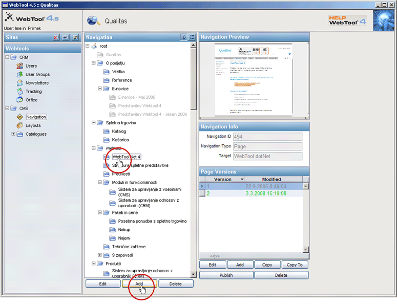 Kliknemo na gumb "Add" oz. "Edit". V tem primeru je prikazan postopek dodajanja navigacije zato smo izbrali gumb "Add"!