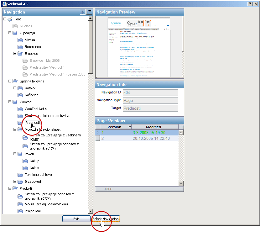 - S klikom na gumb Izberi navigacijo - "Select Navigation" potrdimo izbiro.
