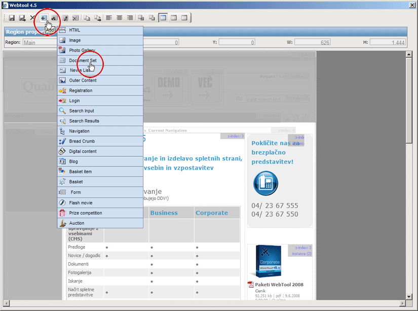 Ko element dodamo in se pokaže v izbrani regiji strani je na element potrebno klikniti, tudi če ga ne bomo več urejali ali prestavljali. S tem potrdimo začetno pozicijo (X=0, Y=0). Šele nato lahko stran oz. verzijo strani shranimo.