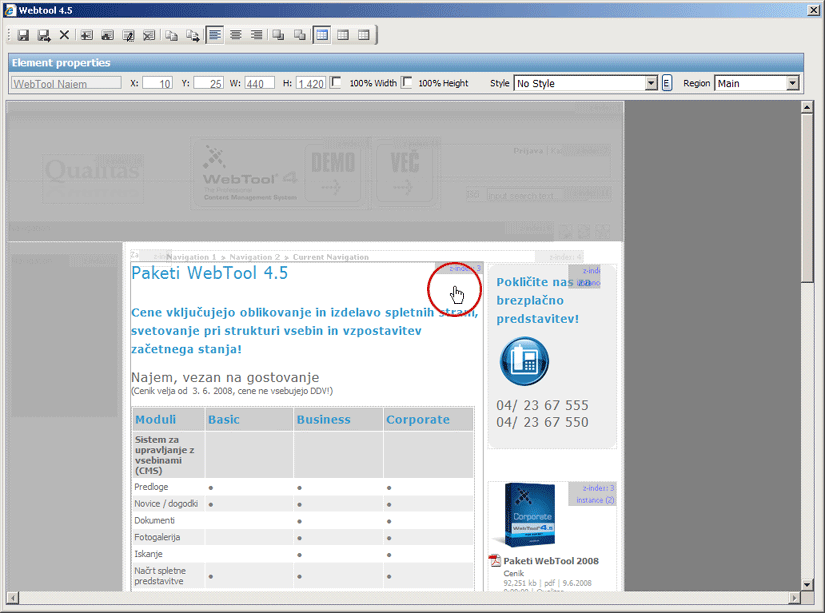 1. Izberemo regijo na katere je element, ki ga želimo urejati (glej Urejanje vsebine na strani).