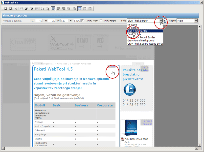 Elementu lahko dodatno določimo stil - obliko kako se bo prikazoval na strani. Obliko si lahko izberemo iz šifranta preddefiniranih stilov.